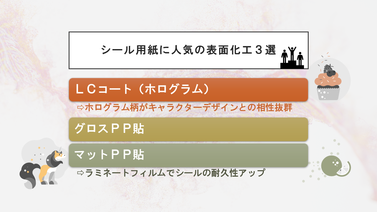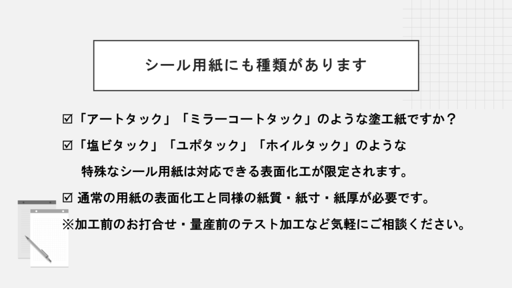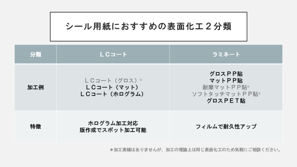 シールのデザイン・保管期間に適した表面化工をお選びください。