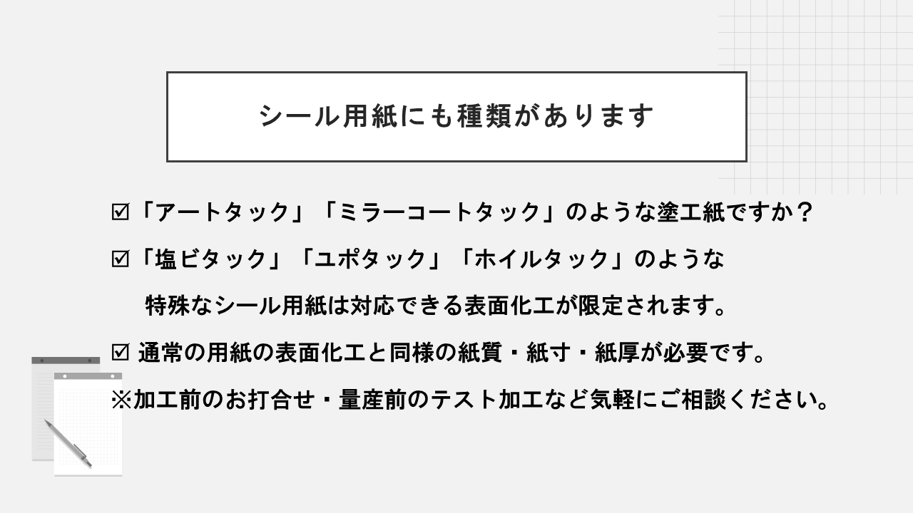 通常の用紙と同様、表面化工に適した紙質・紙寸・紙厚が必要です。