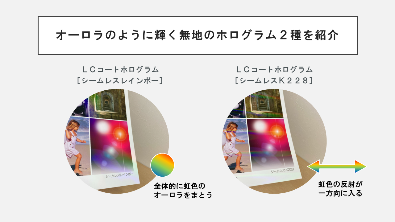 虹色に反射するホログラムに注目し、LCコートと箔押しを特集しました。