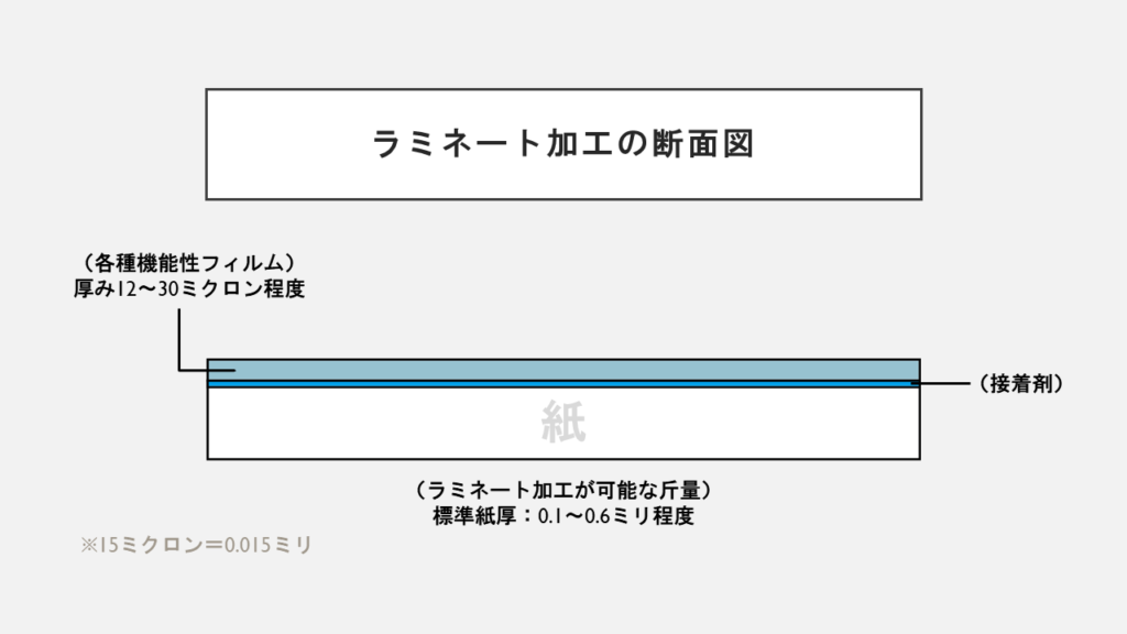 ラミネート加工とは用紙に各種機能性フィルムを貼る加工のことです。