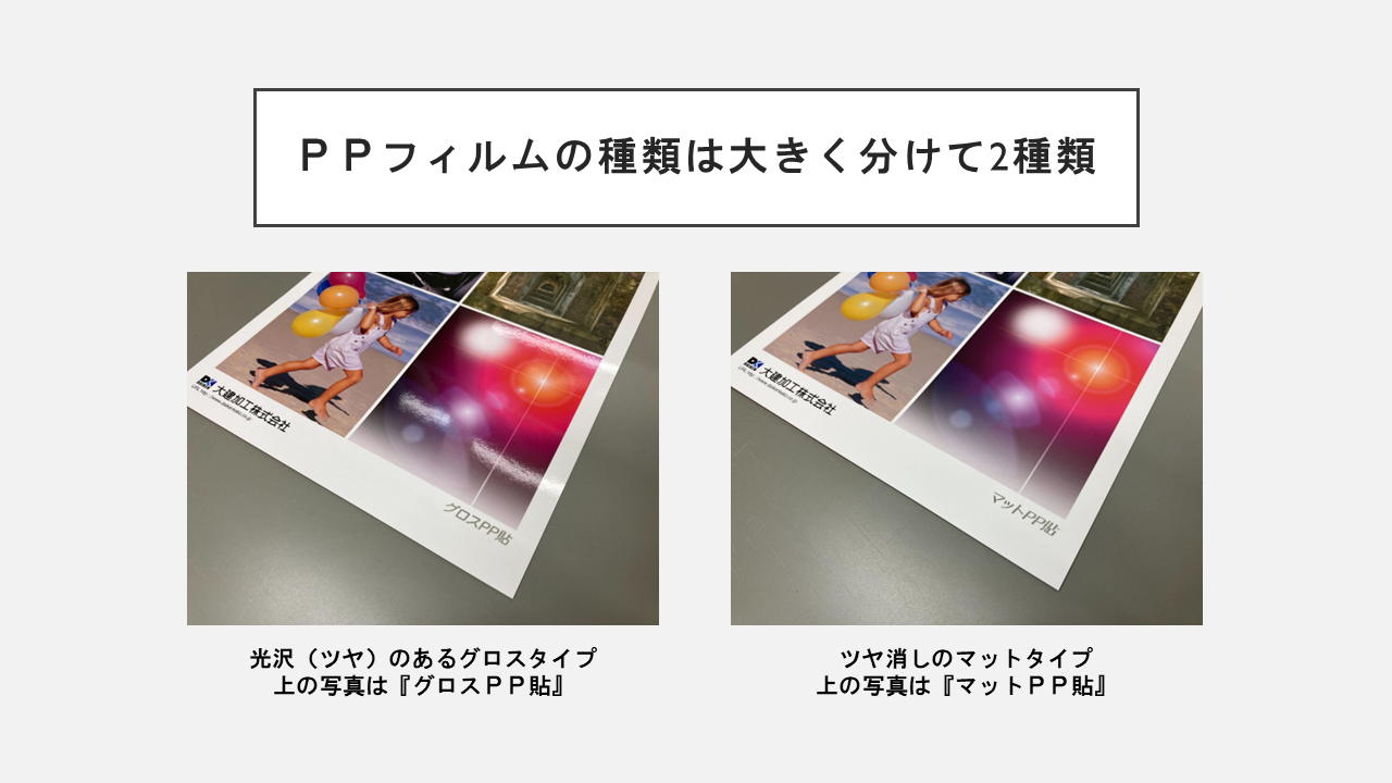 PP貼の場合、ポリプロピレンといった材質のフィルムを貼る加工です。