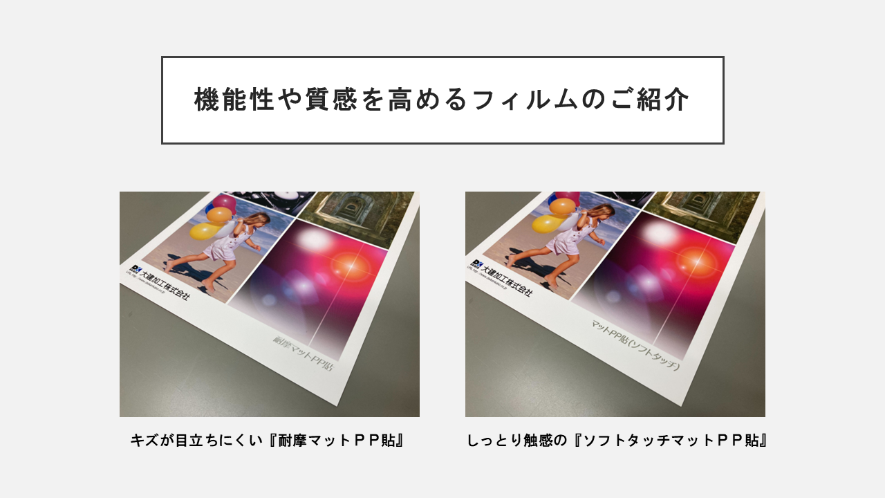 他にもフィルムの種類は多く、質感や機能性の違いで付加価値を高めることができます。